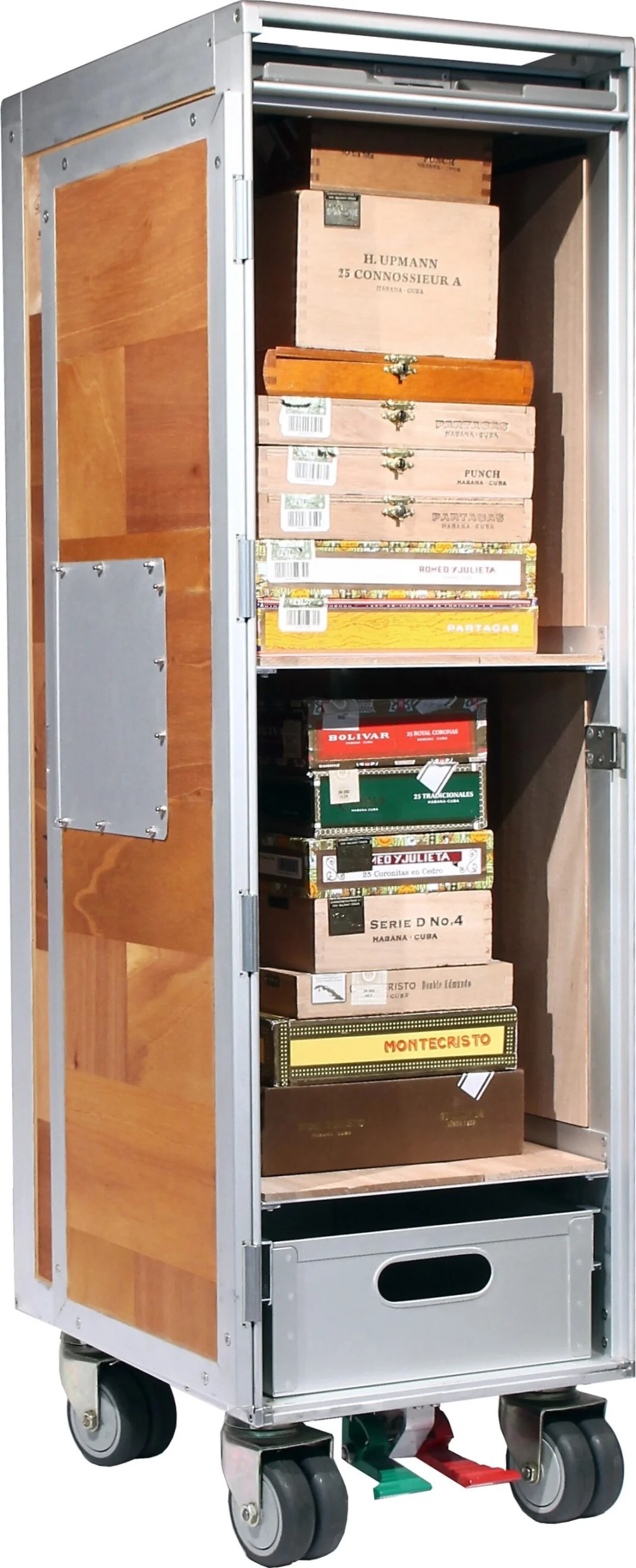- Αυτός ο cabibet υγραντήρας πούρων με ροδάκια είναι ένα πολυτελές αυθεντικό ντουλαπάκι τρόλεϊ απ' αυτά που τοποθετούνται στα αεροπλάνα (καινούργιο από εταιρεία κατασκευής εξοπλισμού για αεροπορικές εταιρείες, αποκλειστικά βελτιωμένο στη Γερμανία από την adorini). Διαθέτει καπλαμά με γνήσια φύλλα ξύλου κέδρου από αυθεντικά κουτιά Habanos και στη συνέχεια σφραγισμένο.