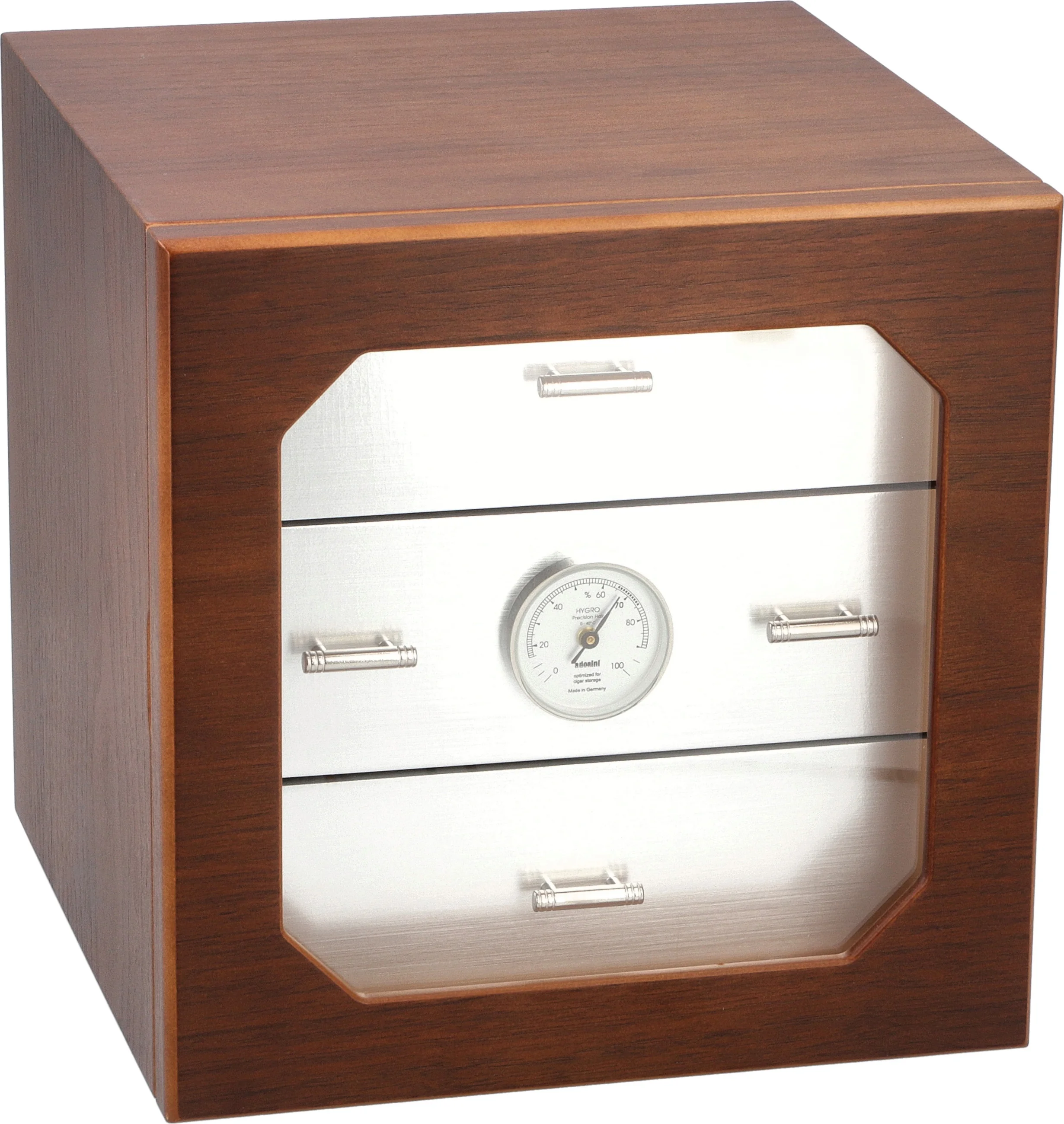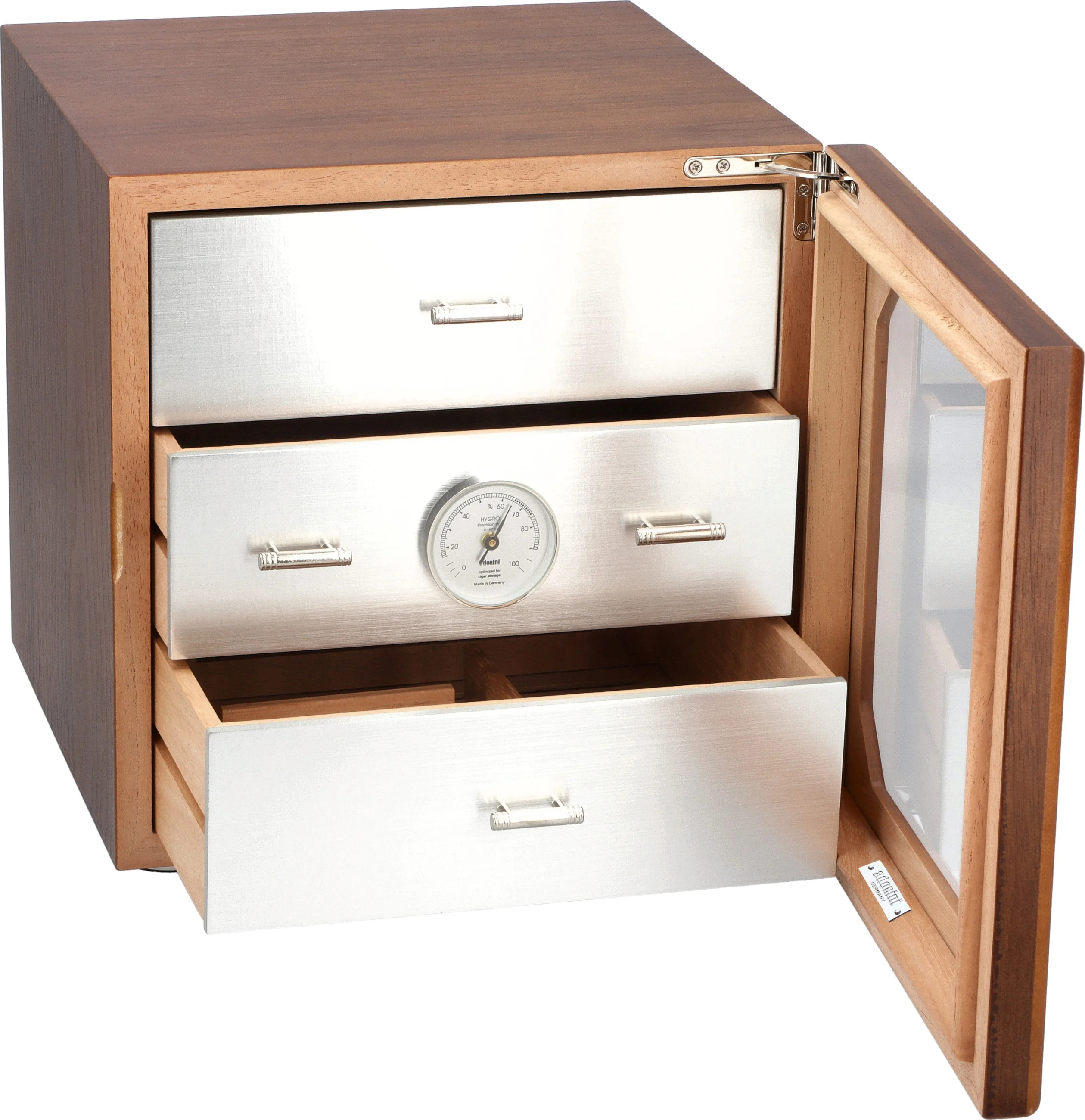 Ο υγραντήρας πούρων Chianti Medium Deluxe Walnut/Alu φέρνει μια δυναμική και μοντέρνα πινελιά σε ένα πραγματικό κλασικό κομμάτι, με μια πολυτελή δομή από σαγρέ καρυδιά που έρχεται σε όμορφη αντίθεση με τρία συρτάρια αποθήκευσης που κοσμούνται με μια φωτεινή πρόσοψη αλουμινίου για μια ελκυστικά νεανική εμφάνιση. Τα συρτάρια αναπαύονται άνετα πίσω από μια πόρτα με γυάλινη επένδυση και εξαιρετικά ισχυρούς μεντεσέδες τεταρτοκύκλου για ομαλό άνοιγμα και κλείσιμο, καθώς και σταθερή και ασφαλή στεγανοποίηση χάρη σε έναν έξυπνο μηχανισμό μαγνήτη. Σε ένα από τα συρτάρια έχει ενσωματωθεί ένα ακριβές υγρόμετρο τρίχας, καθιστώντας τον έλεγχο των επιπέδων υγρασίας παιχνιδάκι χωρίς να χρειάζεται να ανοίξετε ποτέ τον υγραντήρα.