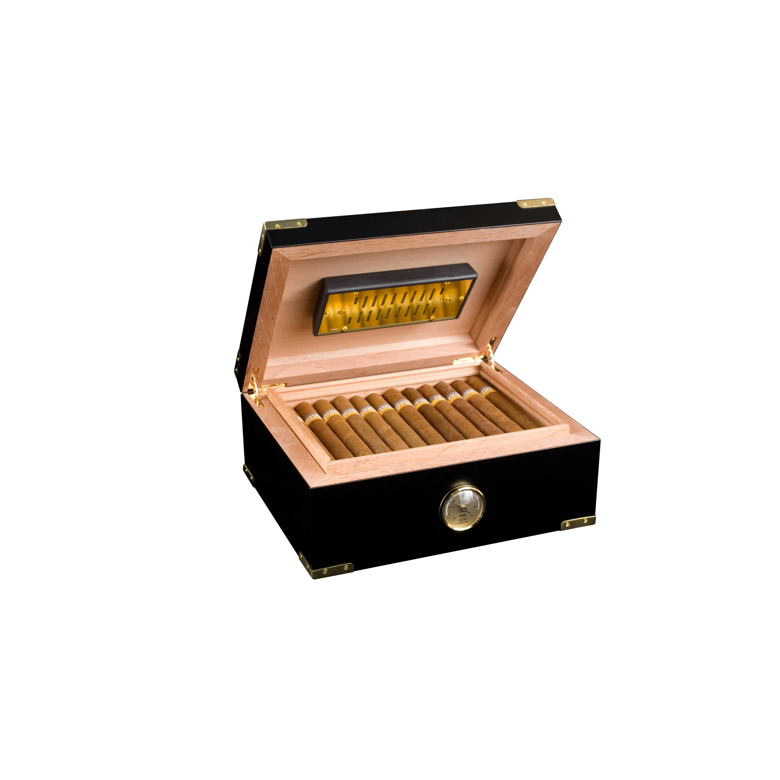 Η διατήρηση της κατάλληλης υγρασίας για έως και 75 πούρα μεγέθους Corona δεν θα αποτελέσει ποτέ πρόβλημα με τον πολυτελή επιχρυσωμένο υγραντήρα της adorini με βάση το ακρυλικό πολυμερές. Αυτό το καλοφτιαγμένο κόσμημα διαθέτει ρυθμιζόμενα ανοίγματα εξαερισμού, ώστε να μπορείτε να βρείτε το τέλειο επίπεδο υγρασίας για τα πούρα σας. Ο υγραντήρας συνδέεται στην κάτω πλευρά του καπακιού μέσω μαγνητών και μιας μεταλλικής πλάκας που είναι κρυμμένη κάτω από τον καπλαμά κέδρου για περαιτέρω βελτιστοποίηση του χώρου και του ελέγχου της υγρασίας.