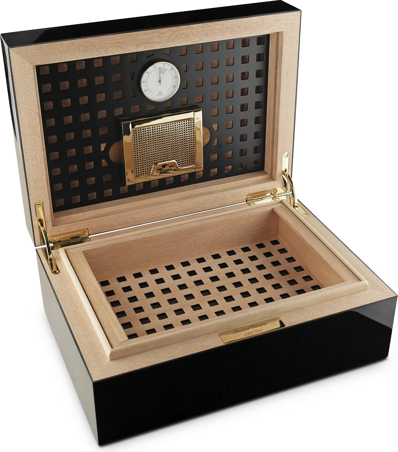 The humidor features a high-gloss black finish reminiscent of fine piano lacquer. Traditional gold elements add elegant accents. The famous Cohiba logo is prominently displayed on the lid. Upon opening, high-quality gold hinges and a plaque indicating the individual limited edition number are revealed.