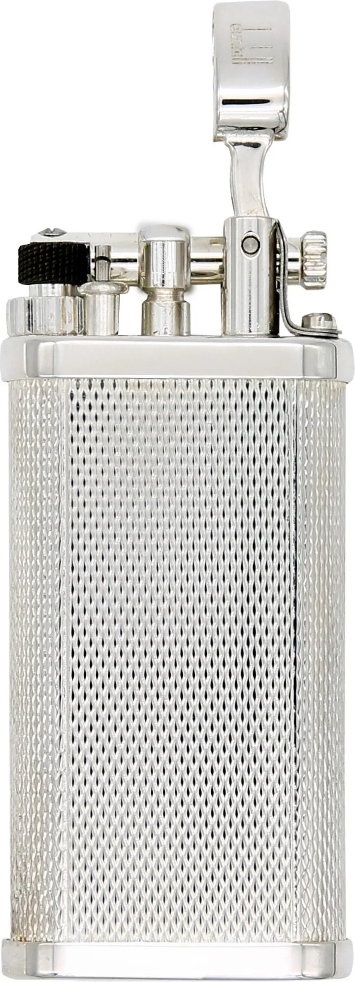 The ignition mechanism is concealed by a protective cover with a fine Dunhill brand engraving. Opening the lid exposes the friction wheel ignition, and turning the wheel toward the operator reliably ignites the flame.